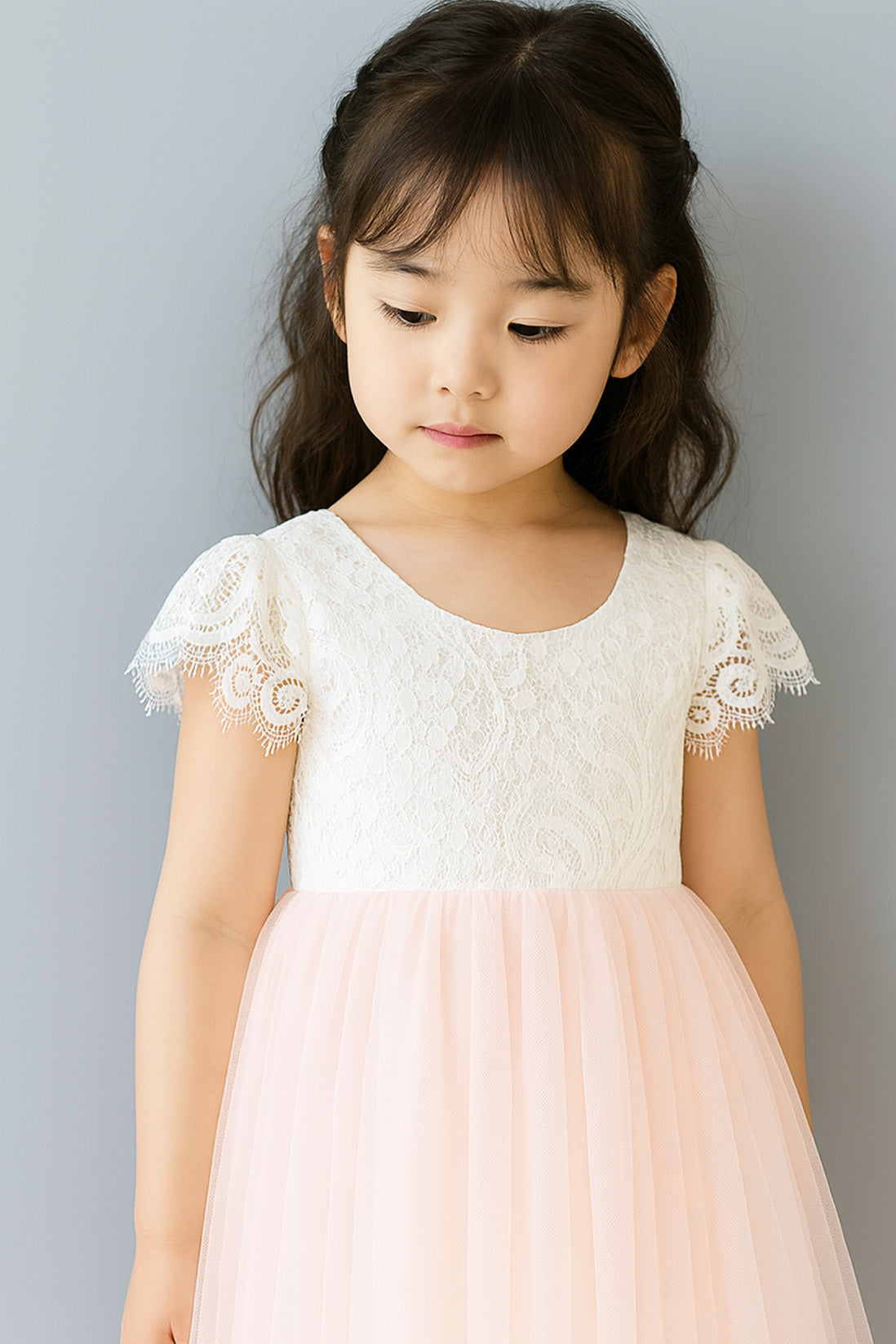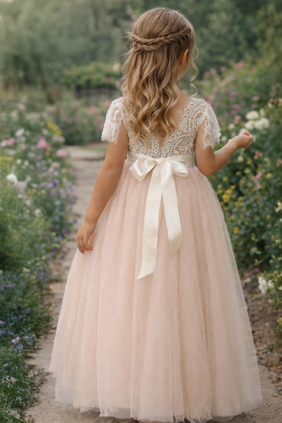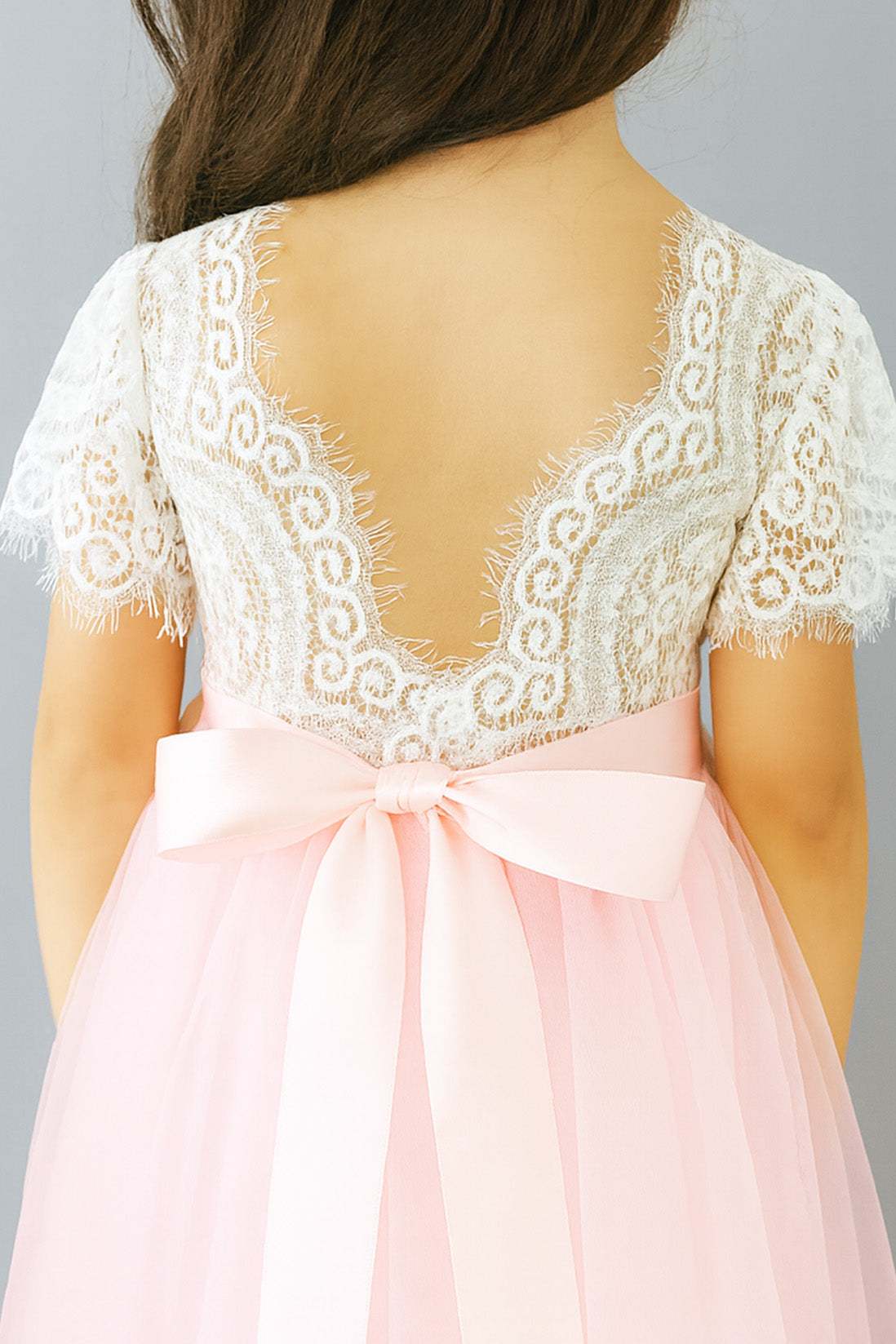 Introducing our Anastasia Dress – a beautiful baby pink soft lace and tulle flower girl dress for wedding perfection. This charming dress is a full-length and perfect for our younger members of the bridal party. Or a gorgeous summer party dress, with an off white soft lace bodice, V shaped back and a tulle layered skirt. This dress does not include the sash.