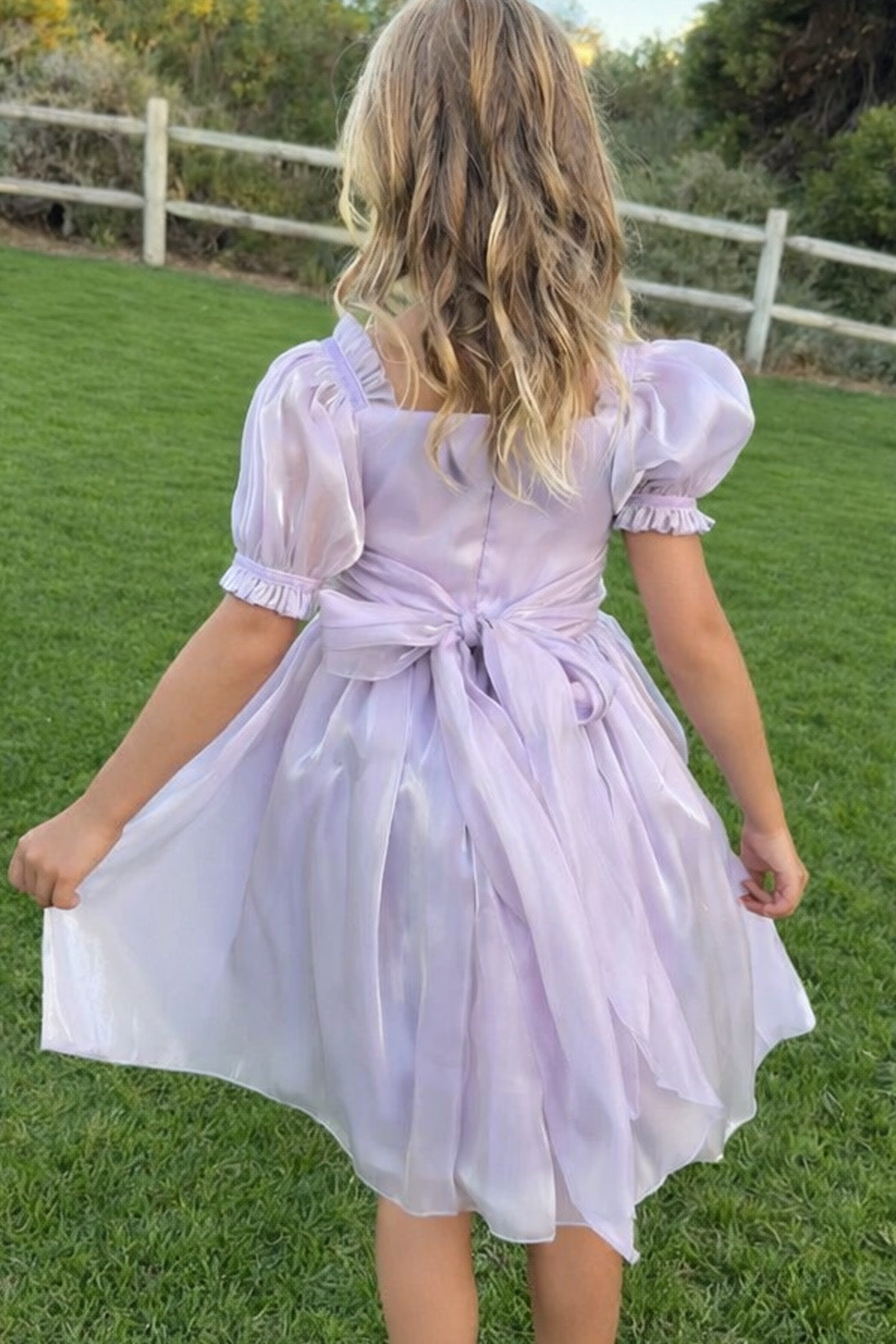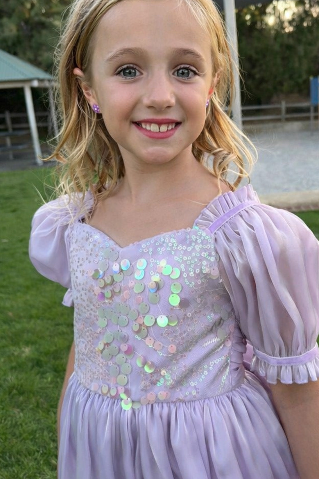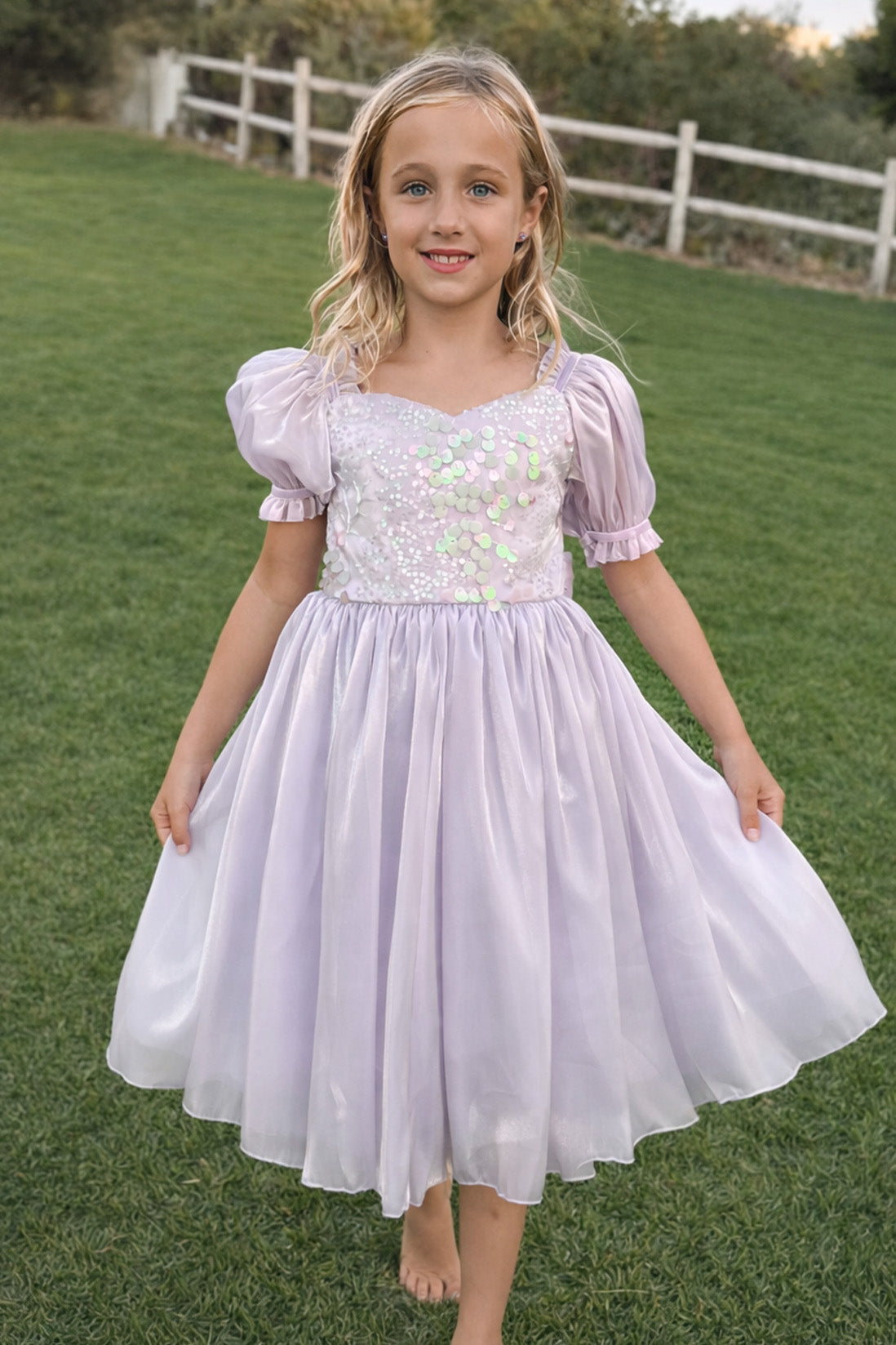 Introducing our Seraphina Sea Pearl Dress – a stunning iridescent mermaid-shiny lilac creation with a sparkling bodice that captures dreamy ocean vibes. Perfect for any occasion, it pairs beautifully with a denim jacket and trainers for a fresh, modern party look.