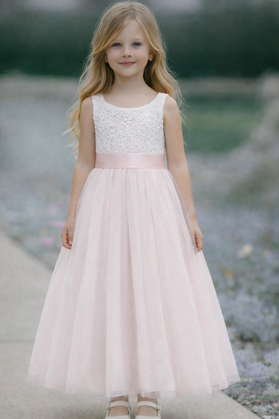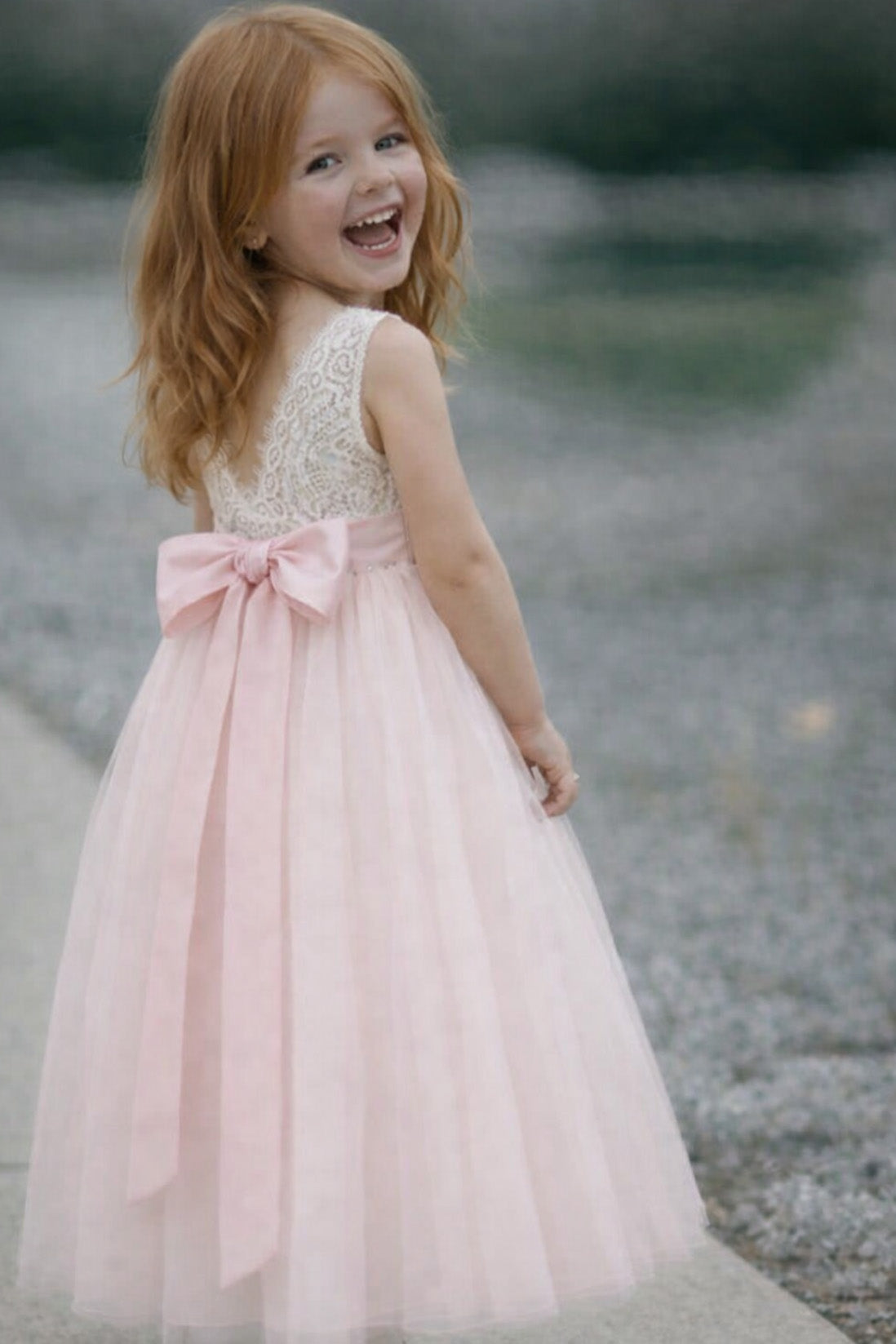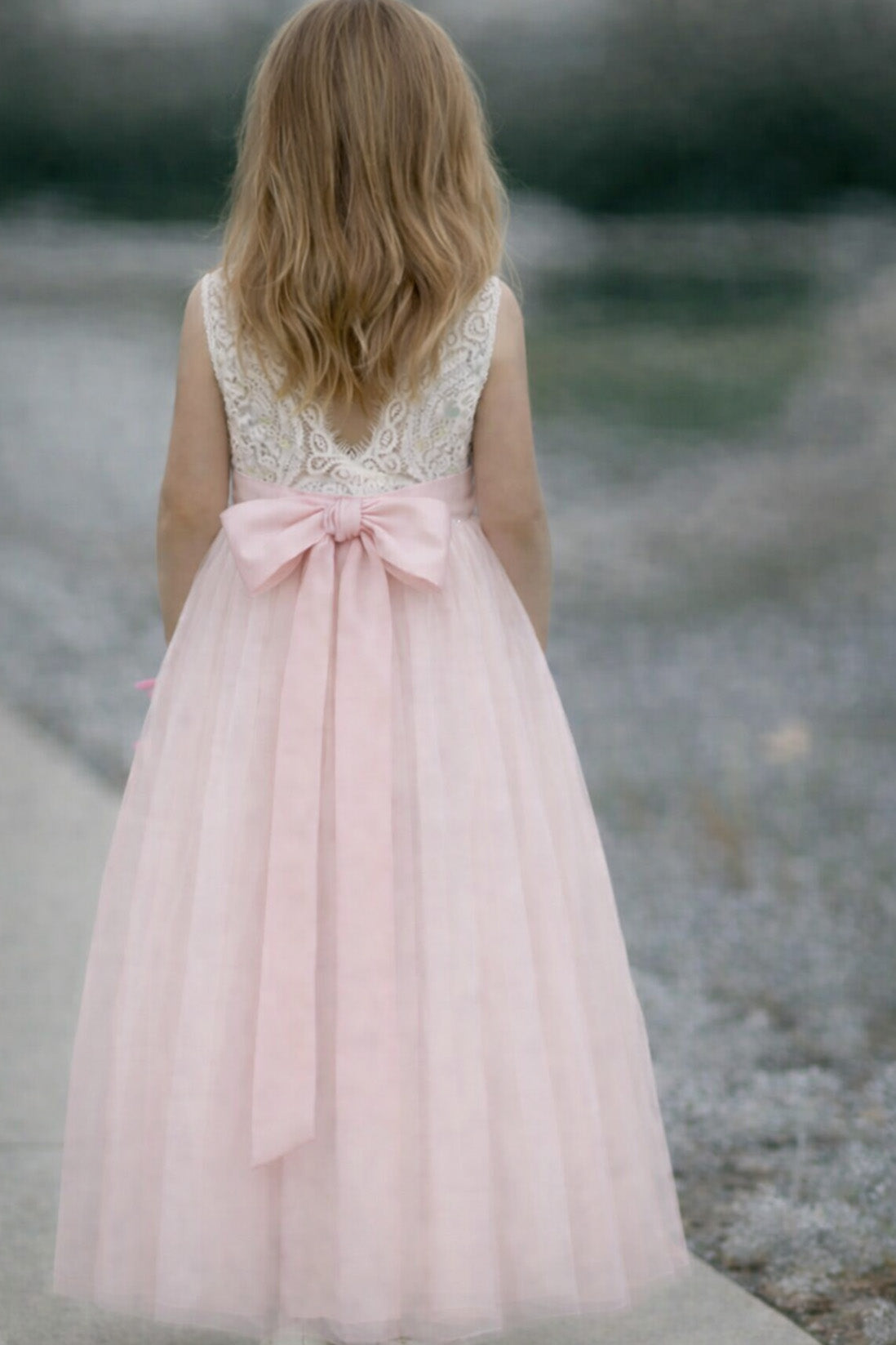 Introducing our Honey Dress – a beautiful baby pink soft lace and tulle flower girl dress for wedding perfection. This charming dress is a full-length and perfect for our younger members of the bridal party. Or a gorgeous summer party dress, with an off white soft lace bodice, V shaped back and a tulle layered skirt. This dress does not include the sash.