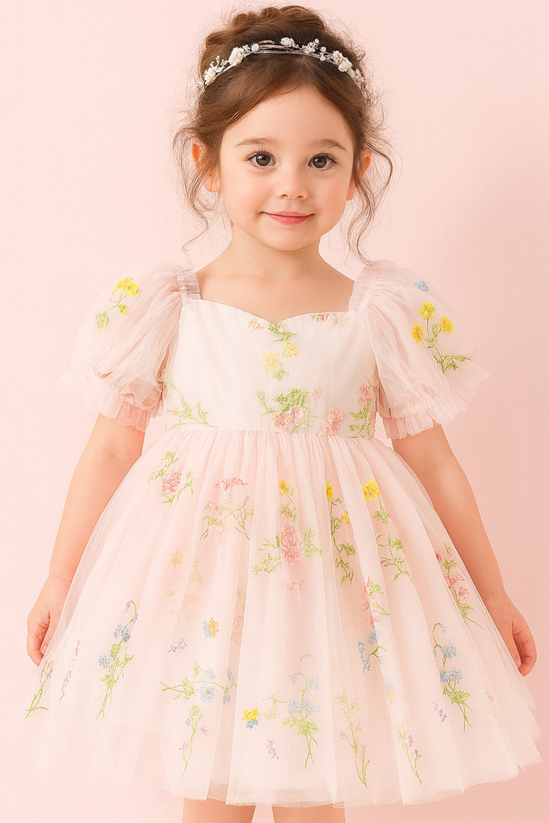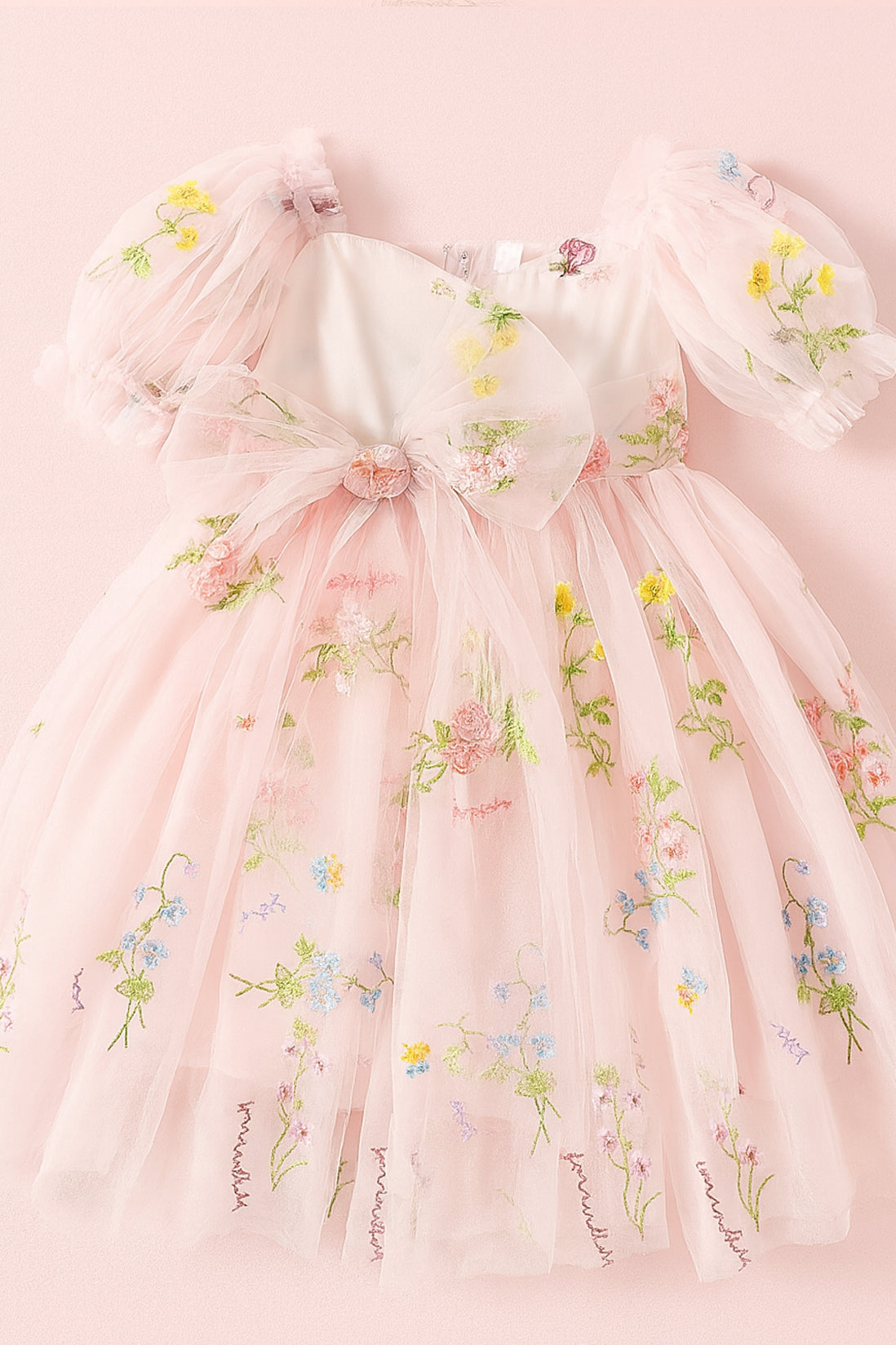 Introducing our Charlee Dress – a beautiful pink floral party flower girl dress for wedding perfection. This charming dress is calf-length and perfect for our younger members of the bridal party. Or add a denim jacket and a pair of trainers and you have the perfect party dress!